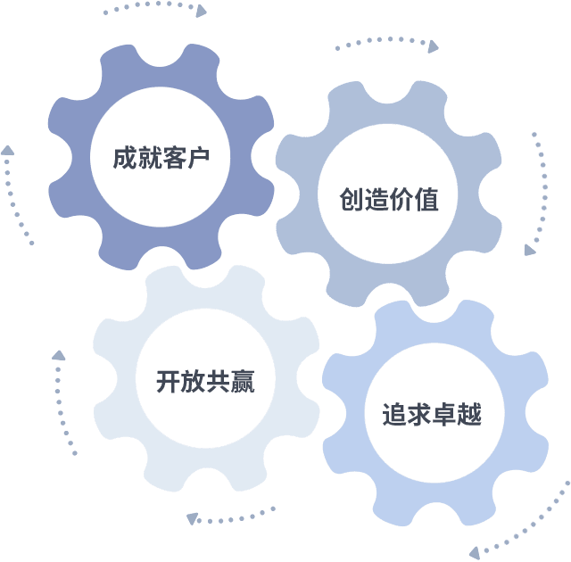 成就客户是一切决策的出发点,,创造价值是衡量所有工作的标准,,,追求卓越是我们做事做人的态度,,开放共赢是我们的格局也是最终的结果。。价值观的齿轮环环相扣,,,推动着组织里的每个人不断向前。。。